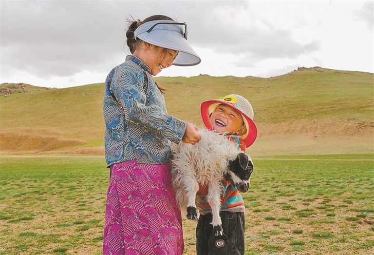 羌塘草原上,牧民和孩子与羊羔亲密互动。本报记者 丹增群培 摄