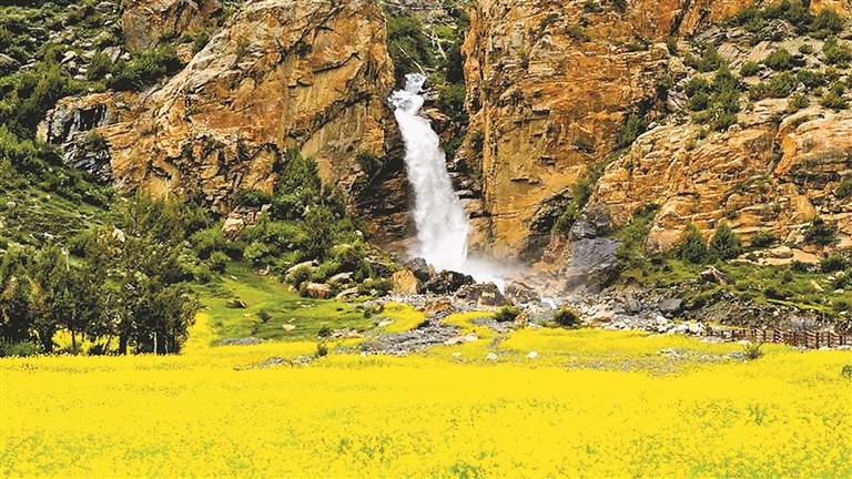 昌都市边坝县三色湖畔飞流的瀑布。本报记者 丹增群培 摄