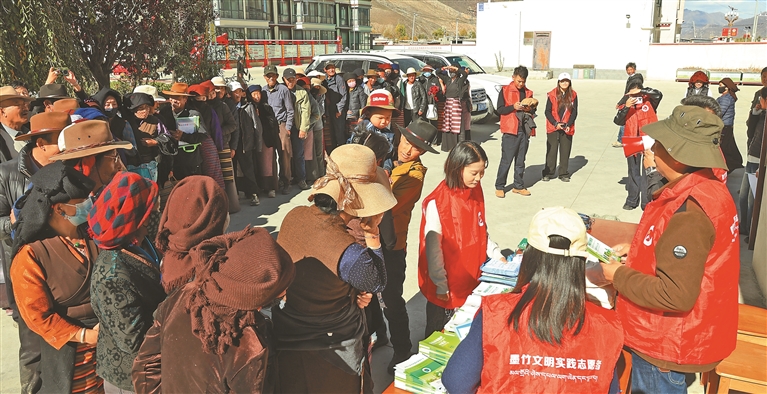 图为干部职工向群众重点普及防震减灾及卫生健康知识。本报记者 格桑伦珠 摄