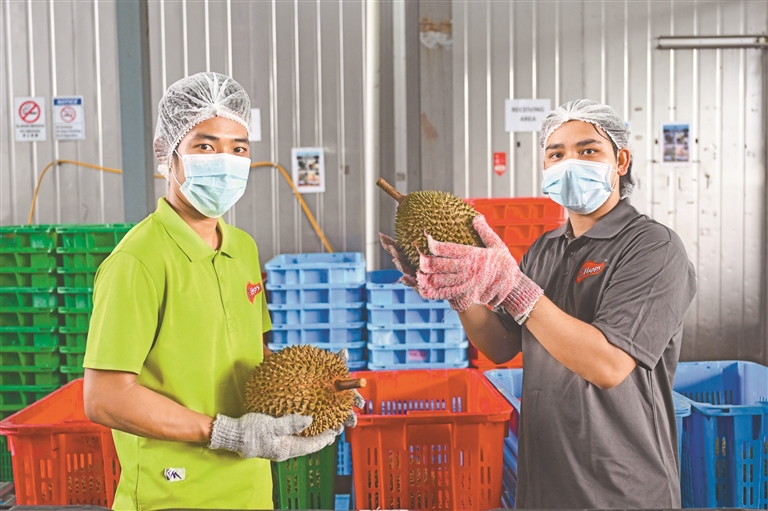 马来西亚彭亨州劳勿是榴莲重要产区之一。依托独特的热带雨林气候与土壤环境,这里的猫山王、黑刺等高端榴莲品种果肉绵密、风味浓郁,在国际市场素有美誉。往年,劳勿榴莲产出的一大部分会通过跨境冷链直供中国市场,如今在两国航线不断增加的前提下,实现了榴莲自然成熟落果收获后,最快36小时送到中国消费者手上。