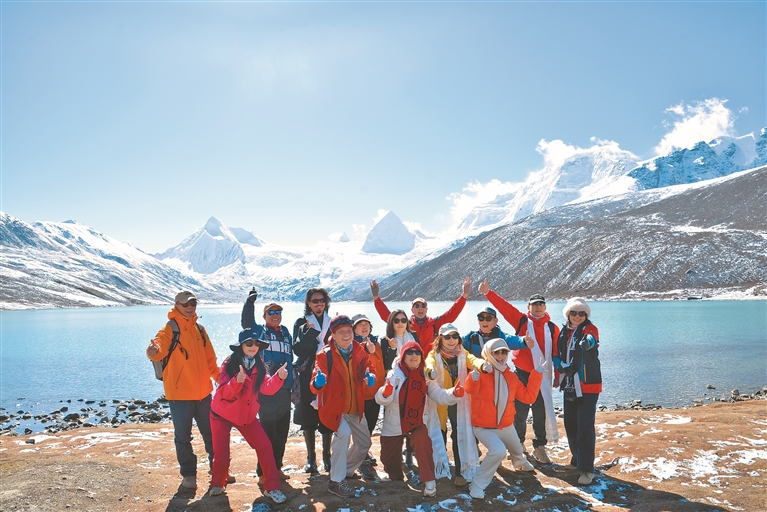 图为电影主创人员与比如县萨普旅游景区游客合影。本报记者 汪纯 摄