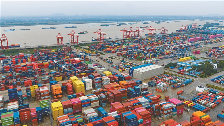 图为10月19日拍摄的江苏省港口集团南京港龙潭港区集装箱码头生产场景(无人机照片)。新华社发(杨素平 摄)