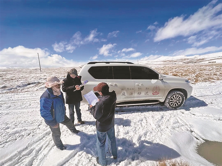 在双湖县,人民法院车载科技流动法庭日行千里,加强与生态管护站、行政村协作,构建“庭·站联合”生态预警网格,及时发布司法保护令和环保倡议书。在安多县,法院干警翻越唐古拉山,深入森布日生态搬迁安置点,通过“加强联络畅渠道”工作法,与群众促膝长谈,倾听民意;雁石坪人民法庭干警还主动加入格拉丹东“长江第一滴水”志愿巡护队,聘请当地党员志愿巡护队员担任生态法治巡护联络员,凝聚保护青藏高原生态的法治合力。