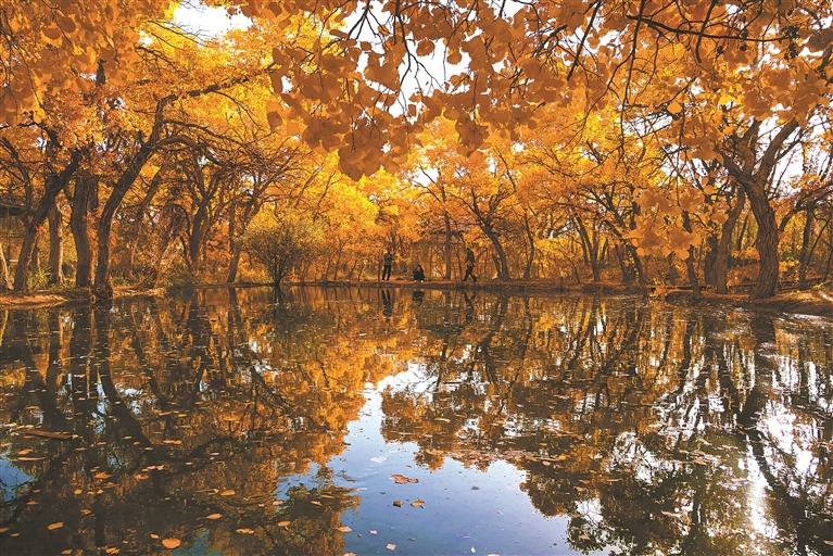 甘肃 图为10月19日,游客在甘肃省敦煌市莫高镇的胡杨林中游览。新华社发(张晓亮 摄)