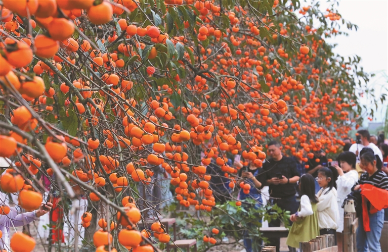四川 图为10月19日,市民和游客在四川省乐山市五通桥区汤家坝村观赏柿子树。新华社发(李华时 摄)