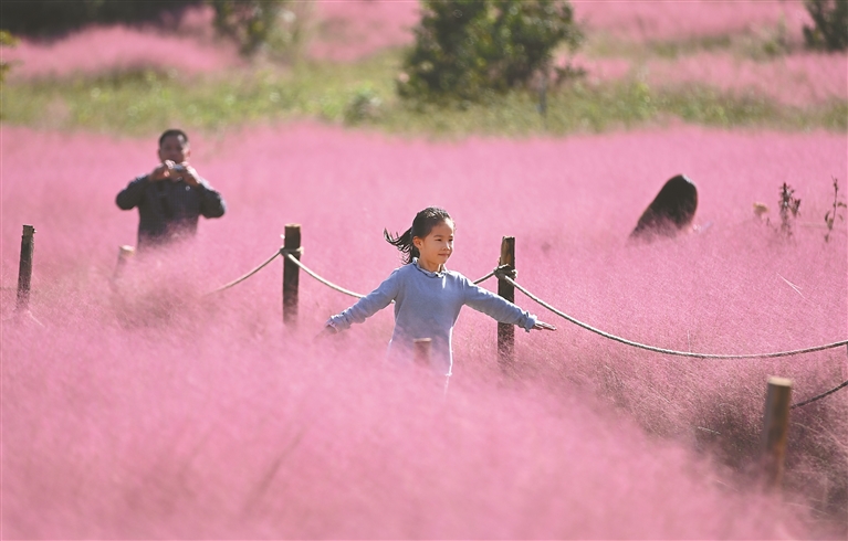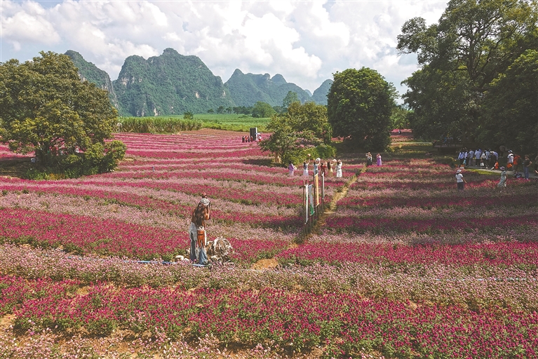 广西 图为10月18日,游人在广西大新县峒那屿湾景区千日红花田赏花游玩。新华社发(喻湘泉 摄)