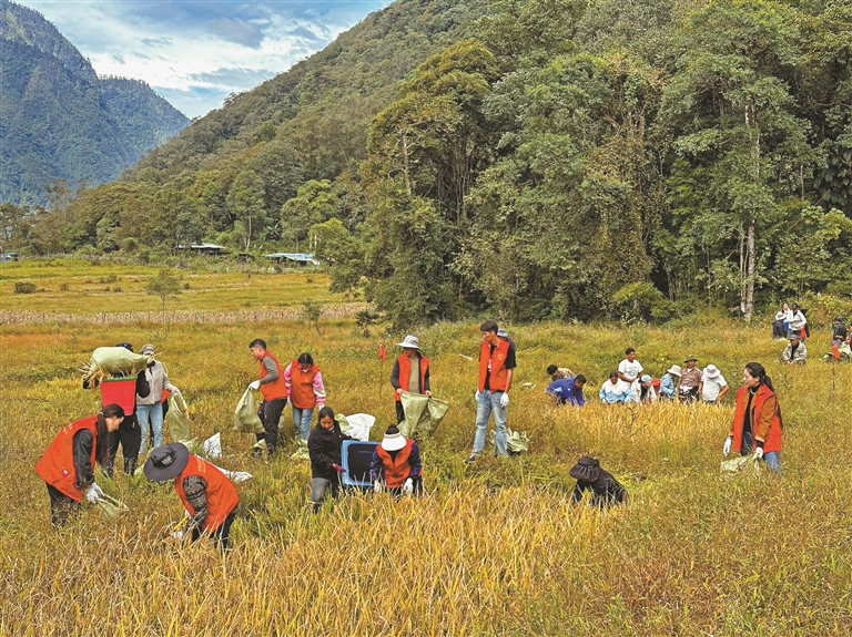 为解决部分农户劳动力短缺、秋收进度慢的难题,林芝市墨脱县格当乡党委政府组织党员干部开展“助农秋收”志愿服务活动。