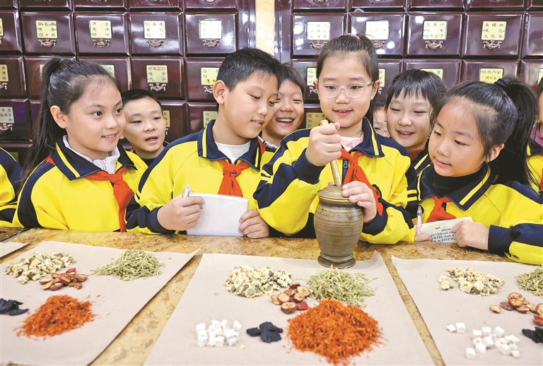 图为10月21日,山东省枣庄市市中区文化路小学的学生在一家中药店体验用铜冲捣药。新华社发(孙中喆 摄)
