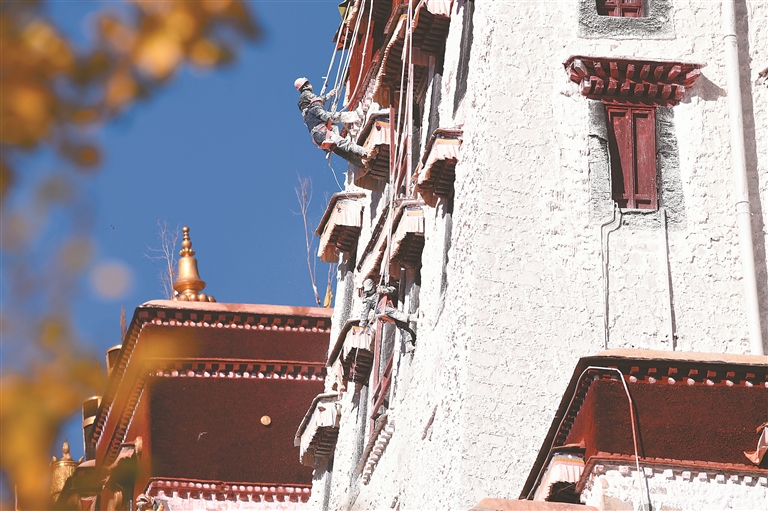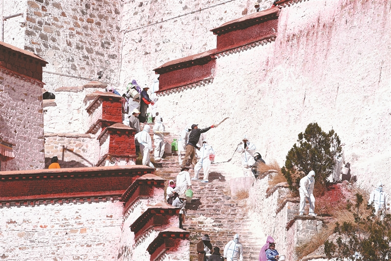 10月22日,拉萨布达拉宫迎来一年一度的粉刷季,人们手持工具,将涂料逐层涂刷在布达拉宫墙上。据了解,布达拉宫刷墙涂料主要以白灰、红土和黄土等天然原料为主,为了增加光泽和黏度,调配过程中还会添加少量的牛奶、白糖、蜂蜜、藏红花和牛骨胶等,让涂料更好地附着在墙体上,为布达拉宫的墙体增添一层保护。