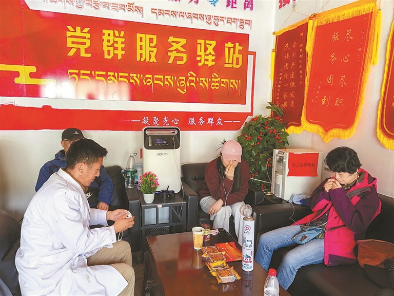山南市浪卡子县白地乡,党员志愿者在党群服务驿站为游客提供供氧服务。本报记者 巴桑旺姆 摄