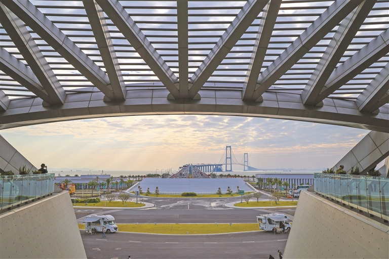 图为10月25日,在深中通道西人工岛中庭的观景平台拍摄的深中大桥和西人工岛景观。新华社记者 毛思倩 摄