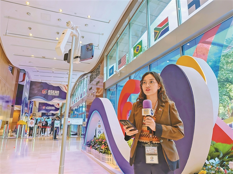 图为10月26日,记者在马来西亚首都吉隆坡的东盟峰会新闻中心工作。新华社记者 邢广利 摄