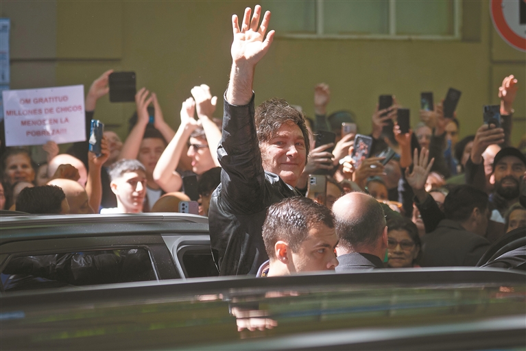 图为10月26日,阿根廷总统米莱(中)在布宜诺斯艾利斯一处投票点外向选民挥手致意。新华社发(马丁·萨巴拉 摄)