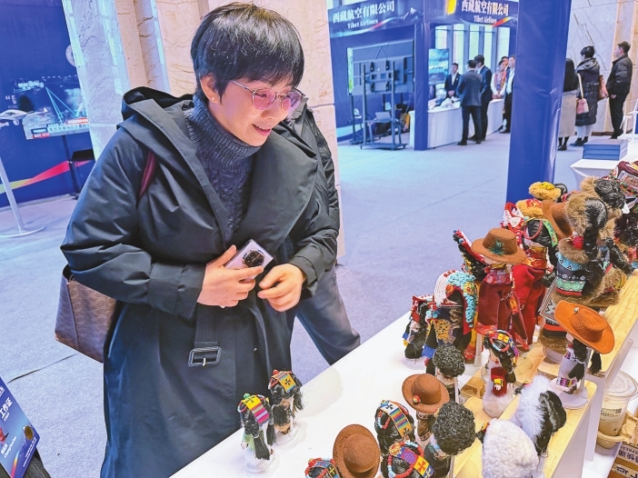 ?与会嘉宾在企业展位前欣赏文创产品。本报记者 索朗琼珠 摄