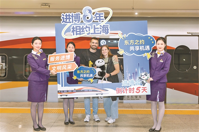 第八届中国国际进口博览会开幕在即,中国铁路上海局集团有限公司上海客运段在上海虹桥站开展“进博8年 相约上海”主题活动,在G8次列车上向旅客介绍进博会亮点。