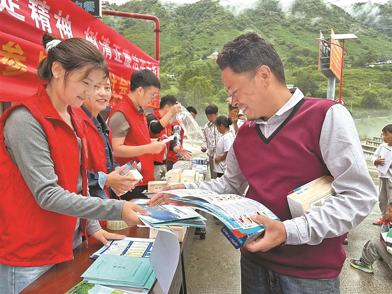 ?图为林芝市墨脱县格当乡党委、政府工作人员向群众发放宣传品。