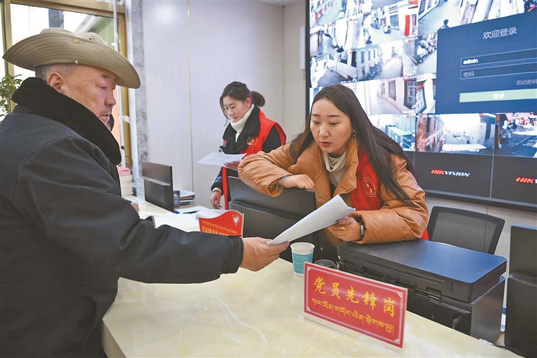 ▲图为拉萨市城关区策门林社区服务大厅工作人员为社区群众服务。