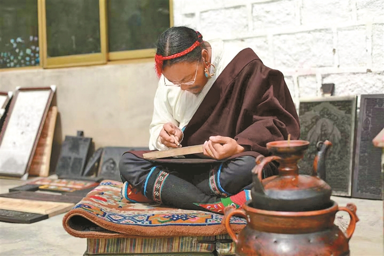 在传承技艺的过程中,斯曲也面临着不少挑战。教徒弟时最大的困难就是让他们静下心来,因为这门手艺需要从小学起,不仅要学习拿工具,还要学习认字和雕刻。“以前光是学习雕刻文字,起码要9个月时间,现在的孩子都很聪明,两年基本就能掌握雕刻技艺。”斯曲欣慰地说。