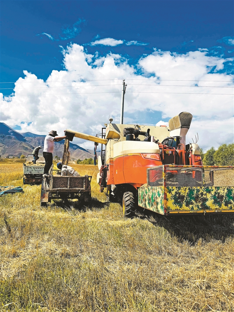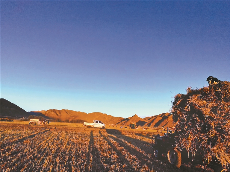 图⑤:强嘎镇典冲村村民在田间收割青稞。