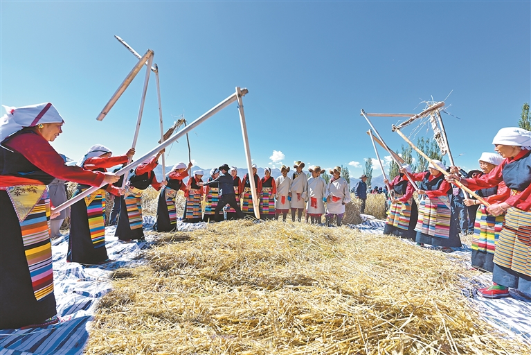 图为深秋时节,在拉萨市林周县强嘎乡典冲村,当地农民用传统方式打场(资料图片)。本报记者 王敏 摄