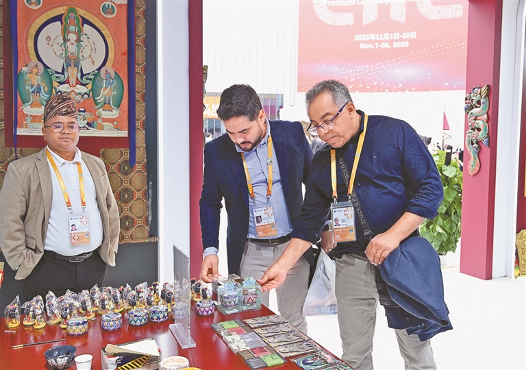 图为第八届中国国际进口博览会西藏馆内的客人在选购商品。