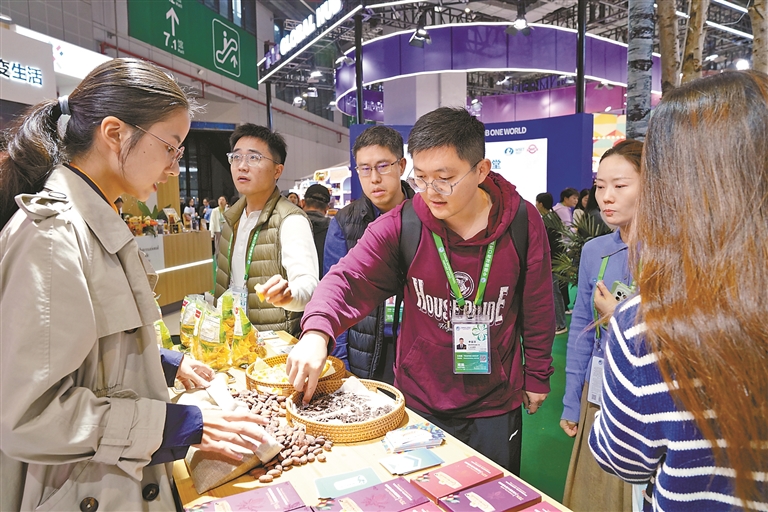 图为11月7日,在农食产品展区,参观者品尝产自厄瓜多尔的巧克力。新华社记者 柳文惠 摄