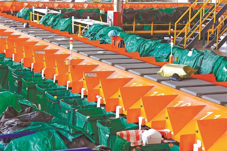 图为11月10日,在位于江苏海安商贸物流产业园的海安市邮政转运中心,工作人员分拣快递包裹。