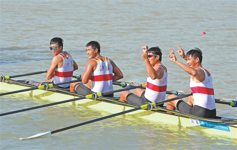 11月10日,第十五届全国运动会赛艇项目决赛在广州举行。江苏队在男子四人双桨决赛中夺得冠军,这是十五运会开幕式后产生的首枚金牌。