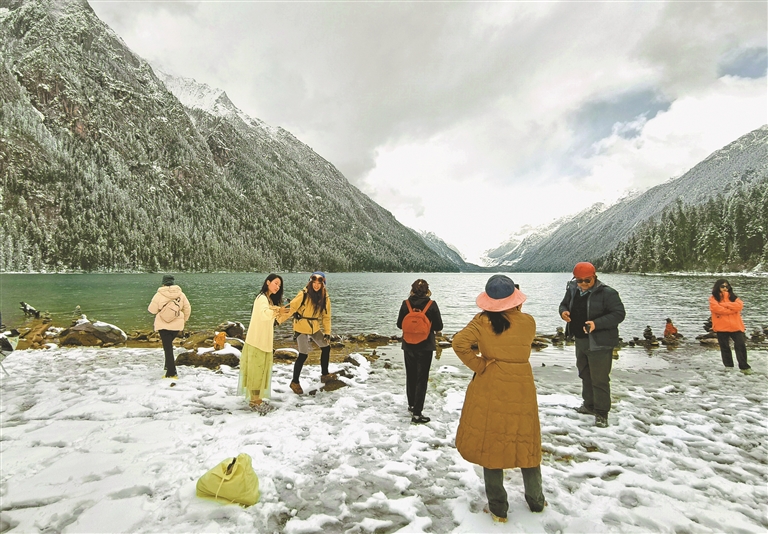 图②:林芝市工布江达县新错湖畔,游客在雪景中打卡留念,尽享高原湖光山色。本报记者 次仁平措 摄