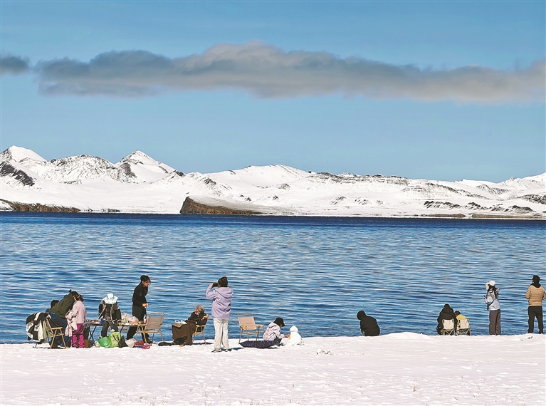 图⑦:山南市普莫雍错湖畔,游客在雪域湖景中拍照,乐享高原冬日美景。本报记者 王敏 摄