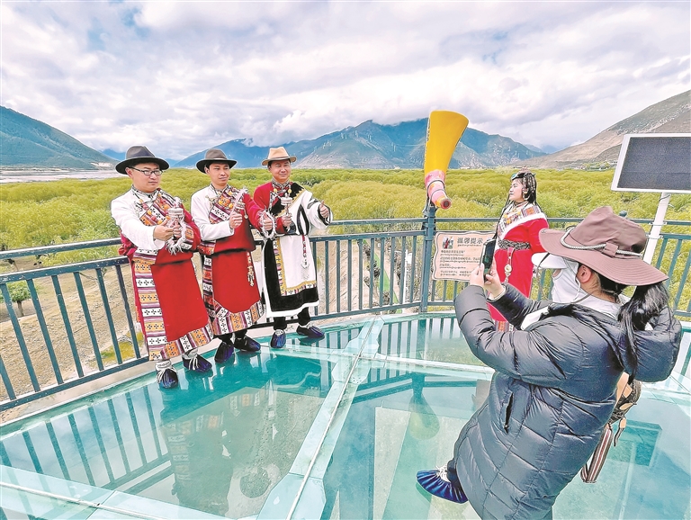 图⑤:林芝尼洋河国家湿地公园旁,游客驻足合影,定格江河美景。 本报记者 次仁平措 摄