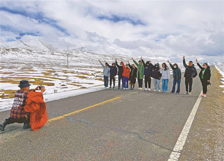 图⑥:在山南市桑日县贡德林草原,游客在雪地公路合影,记录高原冬日氛围。本报记者 白玛泽旺 摄