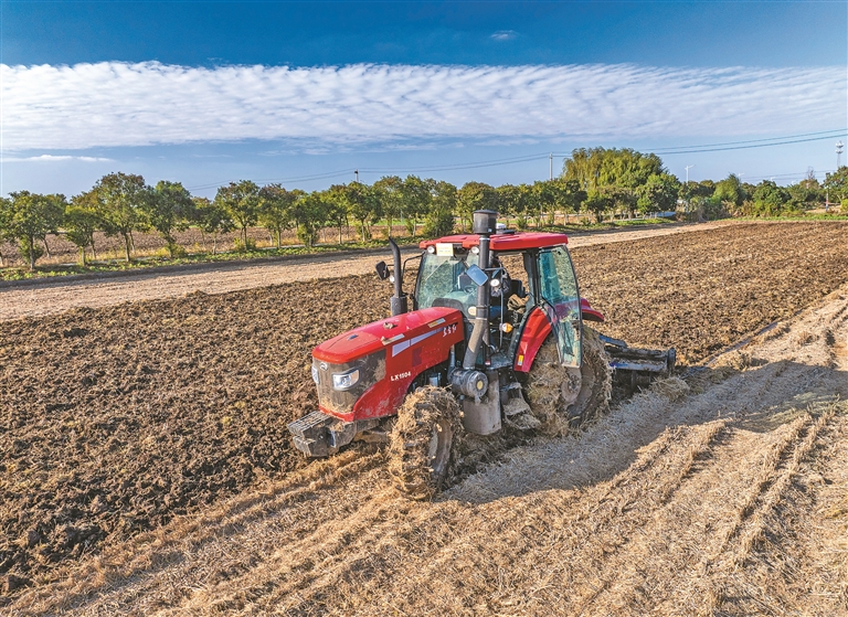 图为11月11日,江苏省兴化市陈堡镇宁乡村农民驾驶农机耕地,为冬小麦播种做准备(无人机照片)。新华社发(周社根 摄)
