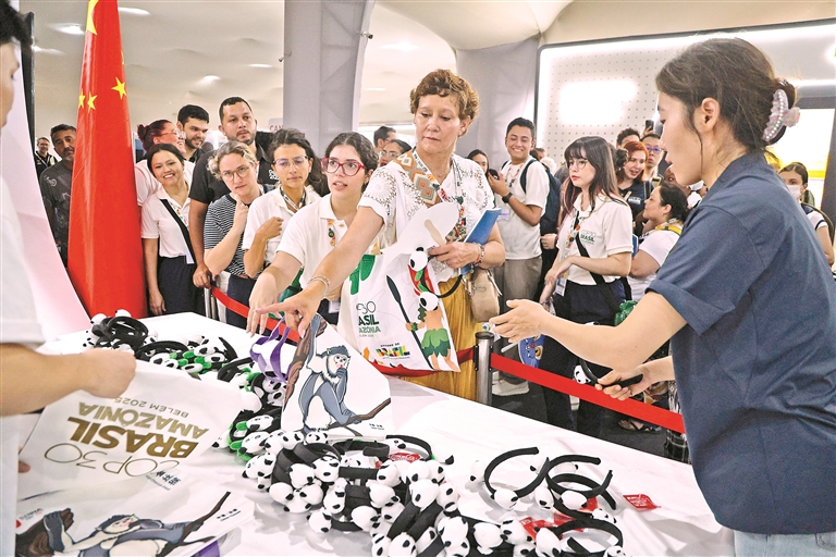 图为11月10日,在巴西贝伦,与会代表在COP30“中国角”领取纪念品。