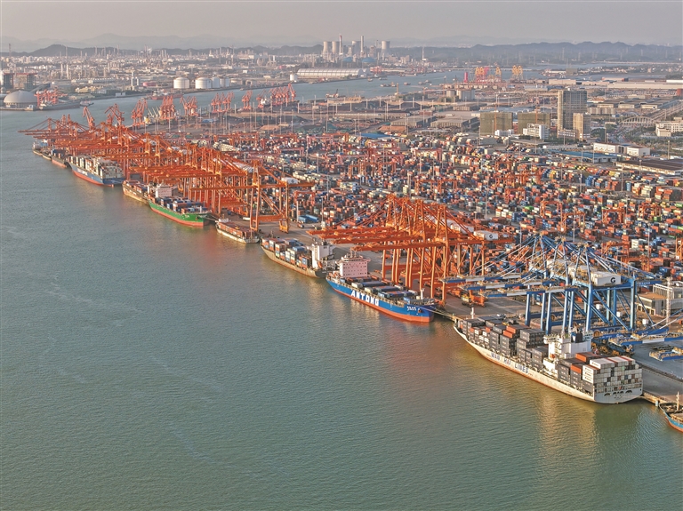 广西北部湾港最新发布的数据显示,10月份北部湾港完成货物吞吐量3287.9万吨,同比增长22.73%。其中,集装箱部分94.71万标准箱,同比增长11.30%。这是繁忙的广西北部湾港钦州港区(11月12日摄,无人机照片)。新华社记者 周华 摄