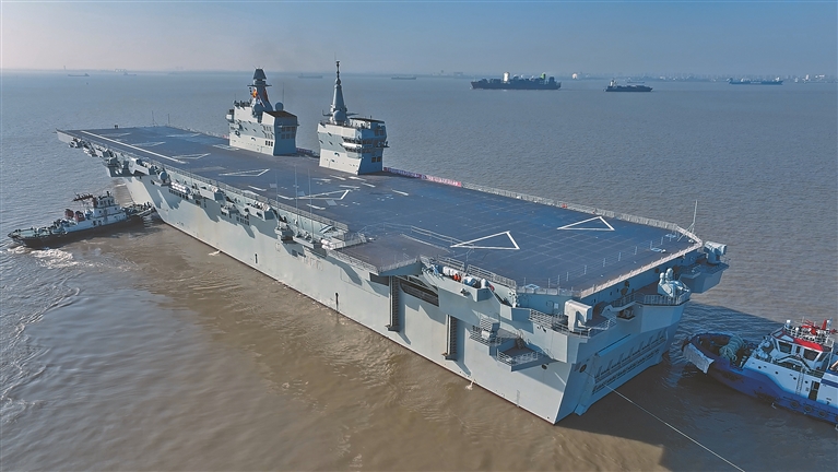 图为11月14日9时许,我国076两栖攻击舰首舰四川舰从上海沪东中华造船厂码头解缆启航,赴相关海域开展首次航行试验任务。新华社发(张良 摄)
