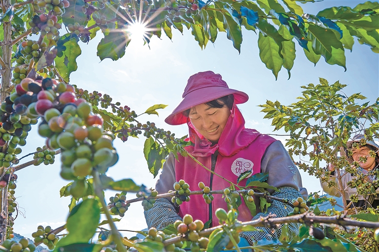 图为11月16日,咖农在云南省保山市隆阳区烫习村一处咖啡园采摘咖啡果。新华社记者 高咏薇 摄