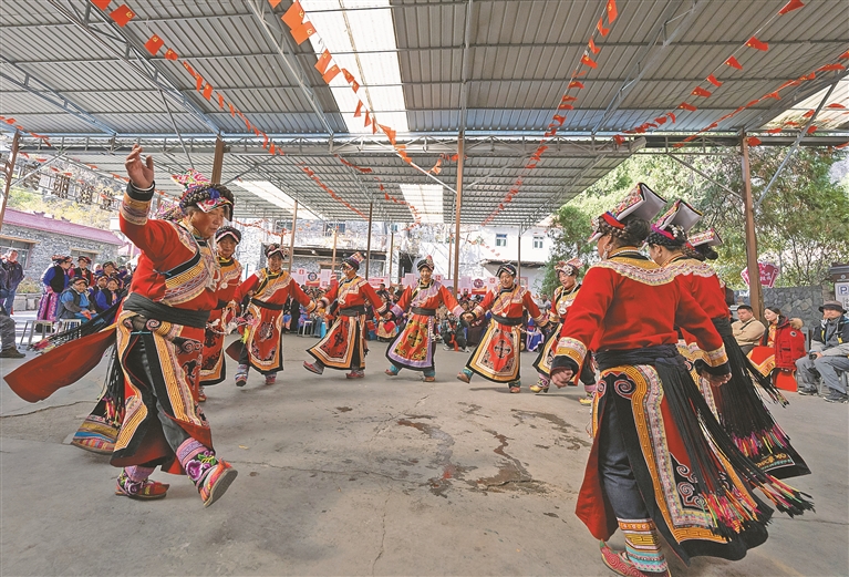 图为11月18日,在茂县赤不苏镇,当地群众在跳萨朗舞。