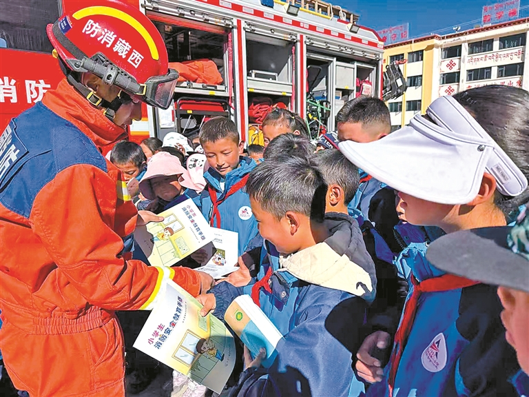 图②:昌都市类乌齐县消防救援大队宣传员开展消防宣传进校园活动。江拉 摄