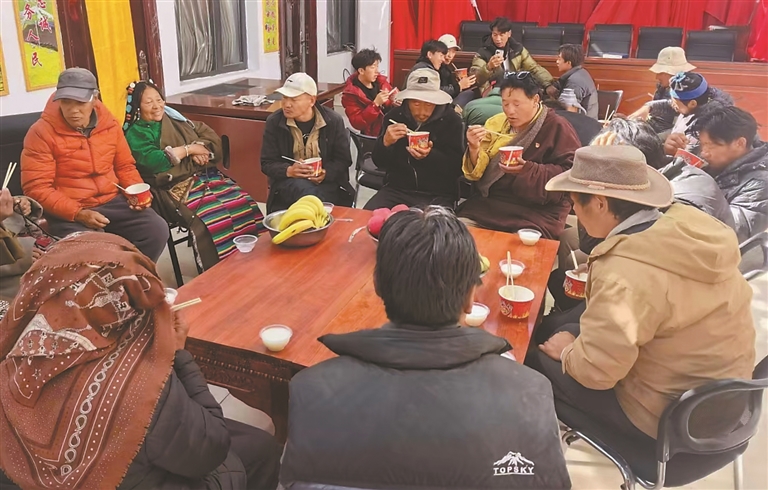 ?图为巴青县干部与群众在村级活动场所同下厨、共进餐。