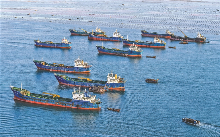 图为11月21日,在山东省荣成市爱伦湾海洋牧场,养殖工人将鲍鱼从海中捞出,装船发往福建(无人机照片)。