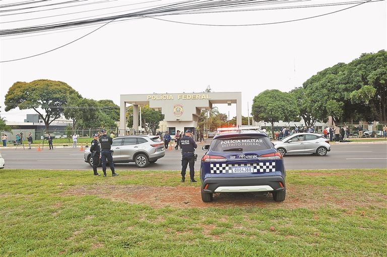 图为11月22日,军事警察在巴西首都巴西利亚联邦警察局门外警戒。