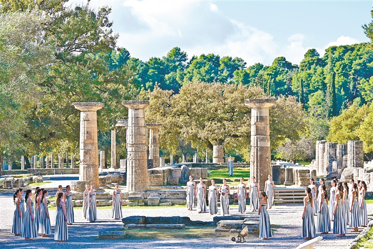 11月24日,2026年米兰—科尔蒂纳冬奥会圣火火种采集仪式在希腊伯罗奔尼撒半岛的古奥林匹亚遗址举行彩排。