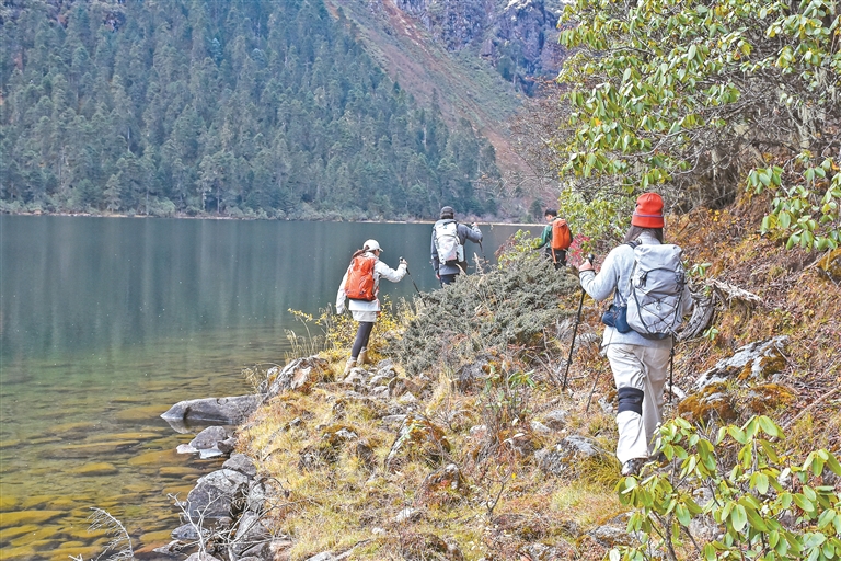 图为游客在萨贡玉错徒步旅游。本报记者 刘枫 摄