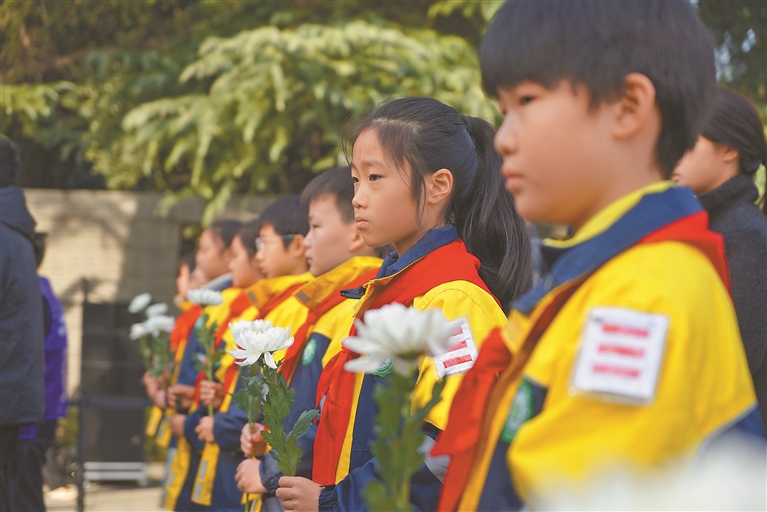 图为11月30日,小学生在南京大屠杀死难者家庭祭告活动现场聆听发言。