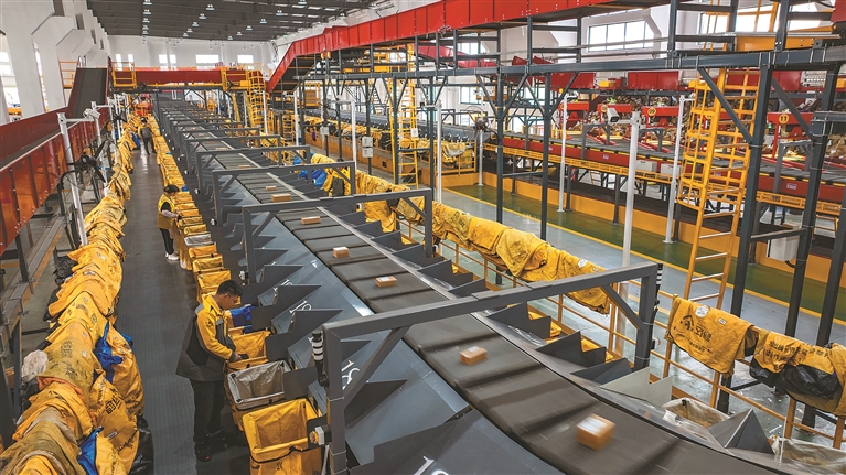 图为在江苏兴化韵达网格仓,工作人员在智能快递流水线上分拣快递包裹(11月13日摄,无人机照片)。新华社发(周社根 摄)
