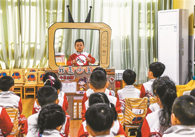 左图:12月1日,河北省唐山市海港经济开发区第二幼儿园的“小主播”给小朋友们讲解交通安全知识。新华社发(刘满仓 摄)