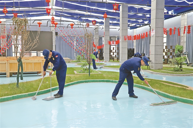 ?图为消防员在认真打扫卫生。 本报记者 彭琦 摄