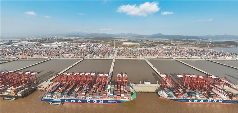 12月2日,宁波舟山港2025年集装箱吞吐量突破4000万标准箱。宁波舟山港近年来发展不断提速,货物吞吐量已连续16年蝉联全球第一,在共建“一带一路”、长江经济带发展、长三角一体化发展等国家战略中发挥出重要作用。图为12月2日,船舶停靠在宁波舟山港梅山港区装卸货物(无人机照片)。新华社记者 翁忻旸 摄