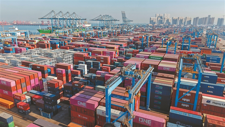 连日来,山东港口青岛港巨轮频靠,作业繁忙,各单位向着全年目标冲刺。今年以来,作为中国北方重要的对外贸易门户,青岛港持续优化国际航线布局,将优质运力向新兴市场倾斜,构建起内外“环环相扣、无缝衔接”的运转体系。目前,青岛港外贸航线总数近240条,联通全球180多个国家和地区的700多个港口。图为12月4日在青岛港前湾港区拍摄的等待转运的集装箱(无人机照片)。新华社记者 李紫恒 摄